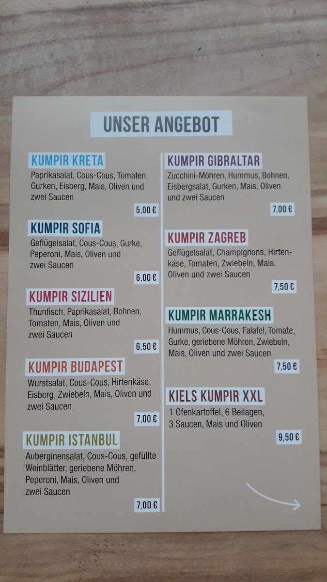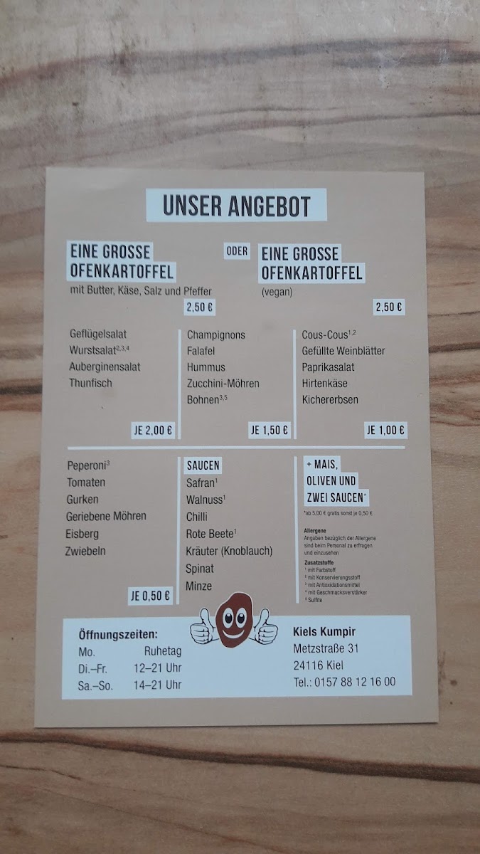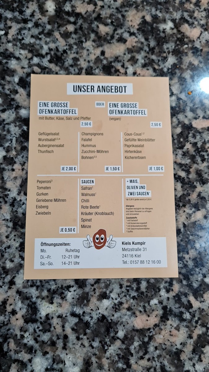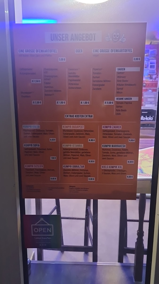 Introducing Kiels Kumpir: Nestled in the heart of Kiel at Metzstraße 31, Kiels Kumpir is a hidden gem for lovers of this traditional Turkish dish. Known for its deliciously baked stuffed potatoes, Kiels Kumpir brings a delightful twist with options for everyone, including vegetarian and vegan varieties. Customers rave about the friendly atmosphere and cleanliness of the place, making it a prime spot for either takeout or dining in.